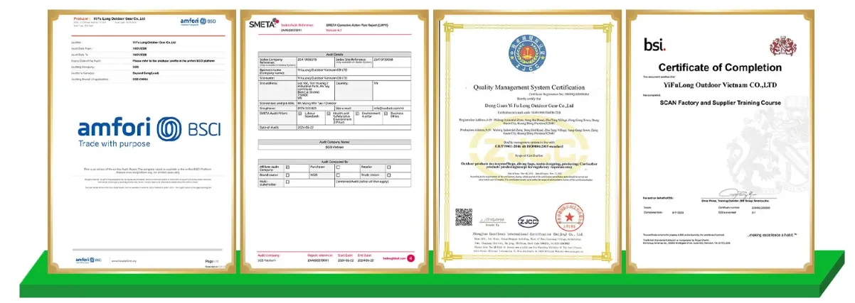 Kami berturut-turut telah memperoleh sejumlah sertifikasi resmi, termasuk ISO 9001 untuk manajemen mutu, BSCI/SMETA untuk tanggung jawab sosial, dan Indeks Higg untuk kelestarian lingkungan.